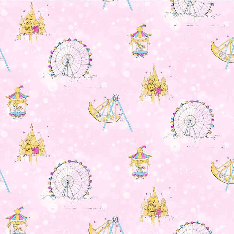 Điểm nhấn đặc biệt của mẫu giấy dán tường này chính là bộ sưu tập các hình ảnh mang đậm chất “fairytale”. Bạn sẽ bắt gặp những tòa lâu đài nguy nga với ánh vàng kim lấp lánh như được dát vàng, gợi nhớ về những vương quốc xa xôi trong truyện cổ tích. Bên cạnh đó là hình ảnh vòng đu quay rực rỡ, ngựa gỗ carousel đang xoay tròn trong điệu nhạc vui tươi, và cả những chiếc thuyền hải tặc nhỏ bé sẵn sàng ra khơi khám phá đại dương. Mỗi chi tiết đều được tô điểm bằng các màu sắc tươi tắn như vàng, xanh dương nhạt, hồng đậm, tạo nên một bức tranh tổng thể sống động và đầy màu sắc.