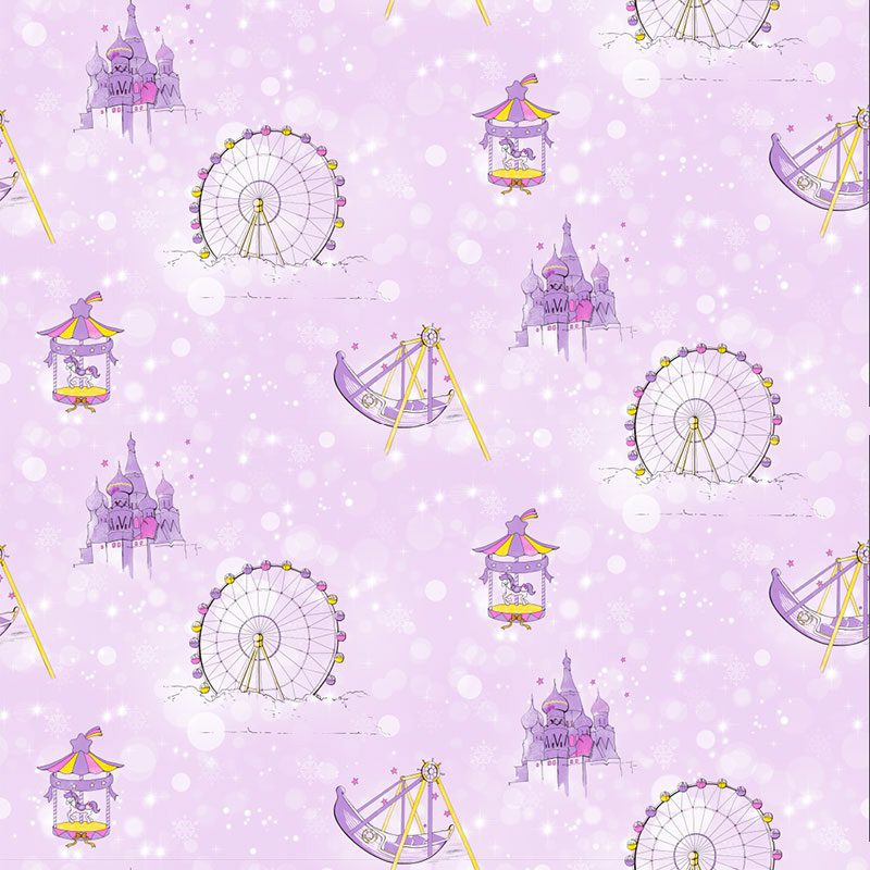 Trên nền hồng tím thơ mộng ấy, các chi tiết họa tiết được điểm xuyết một cách tinh tế. Những cấu trúc của vòng đu quay và chiếc thuyền hải tặc được tô điểm bằng sắc vàng nhạt ấm áp, tạo nên điểm nhấn tươi sáng và thu hút. Tím đậm hơn được khéo léo sử dụng cho các tòa lâu đài cổ kính với tháp nhọn vươn cao và mái che duyên dáng của vòng quay ngựa gỗ, mang đến sự tương phản nhẹ nhàng, tạo chiều sâu và sự sinh động cho bức tranh tổng thể. Đặc biệt, sắc trắng tinh khôi của các họa tiết bông tuyết nhỏ li ti và hiệu ứng bokeh lung linh rải rác khắp bề mặt, tựa như những đốm sáng kỳ ảo, càng làm tăng thêm vẻ huyền ảo và thơ mộng cho không gian.