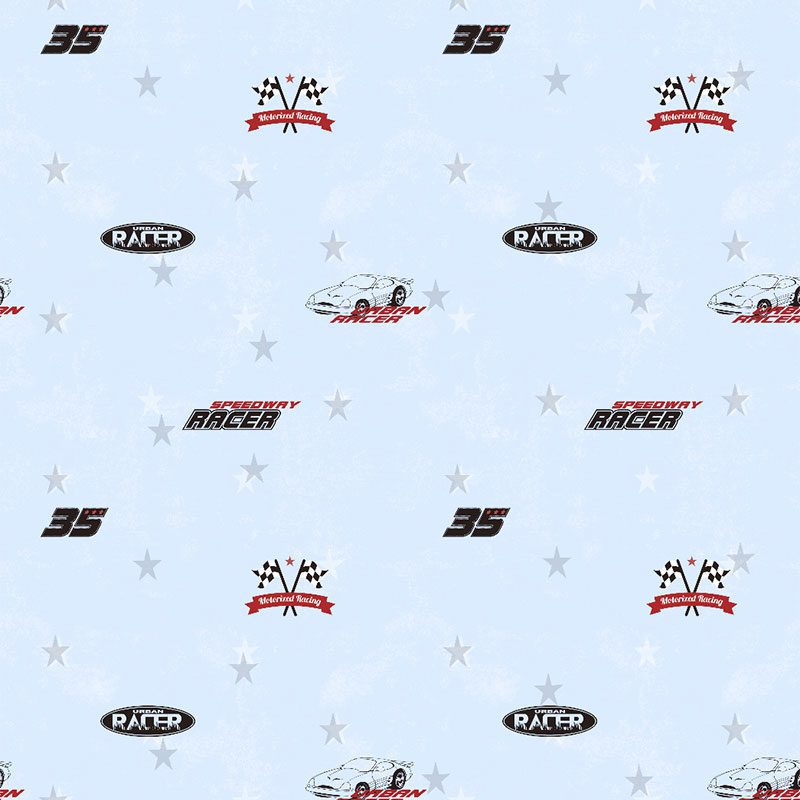 Họa tiết xe đua được tạo hình theo phong cách đồ họa (stylized), không mô phỏng vân tự nhiên. Các hình ảnh được sắp xếp lặp lại một cách có trật tự trên toàn bộ bề mặt giấy, tạo thành một mẫu pattern liên tục và đồng đều, không gây cảm giác ngắt quãng hay rối mắt. Bề mặt giấy dán tường có vẻ phẳng mịn và có thể có độ lì (matte finish), giúp các họa tiết được hiển thị sắc nét, chân thực, không bị bóng lóa dưới ánh đèn.