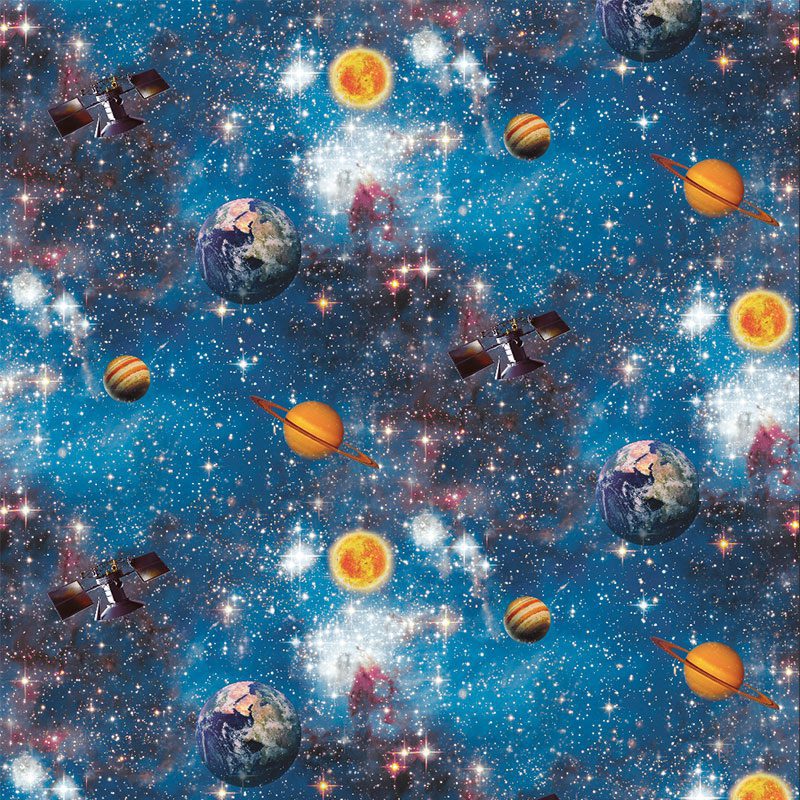 Ngay từ cái nhìn đầu tiên, Giấy Dán Tường Giá Rẻ Fairytale 39009-1 gây ấn tượng mạnh bởi tông màu chủ đạo là xanh dương đậm, tái hiện hoàn hảo bầu trời đêm sâu thẳm và bí ẩn của vũ trụ. Trên nền tối ấy, vô số chi tiết màu sắc rực rỡ bừng sáng, tạo nên một dải ngân hà đầy màu sắc. Sắc trắng tinh khôi và vàng ấm áp của hàng triệu ngôi sao nhỏ lấp lánh như dẫn lối cho những giấc mơ. Hình ảnh Mặt Trời và các hành tinh có vành đai (gợi nhớ Sao Thổ) hiện lên với tông cam và vàng rực rỡ, mang đến cảm giác ấm áp và gần gũi. Trái Đất thân quen xuất hiện với các mảng màu xanh dương của đại dương, xanh lục và nâu của đất liền, nhắc nhở về ngôi nhà chung của chúng ta giữa không gian bao la. Các hành tinh sọc vằn với tông cam và vàng (tương tự Sao Mộc) thêm vào sự đa dạng về hình khối. Những vệ tinh nhân tạo màu xám bạc hiện đại xuất hiện như biểu tượng của sự tiến bộ khoa học. Đặc biệt, sự góp mặt của các cụm tinh vân với sắc xanh lam, hồng phớt và tím nhạt tạo nên chiều sâu, sự mềm mại và nét mơ mộng cho toàn bộ thiết kế. Dù nền giấy là màu tối, sự phong phú và tươi sáng của các chi tiết họa tiết đảm bảo không gian không bị u tối, đặc biệt khi kết hợp với hệ thống chiếu sáng phù hợp. Sản phẩm này không có hiệu ứng vân nổi 3D hay kết cấu sần đặc biệt; bề mặt được in phẳng, có thể mờ mịn hoặc hơi bóng nhẹ, tập trung hoàn toàn vào hiệu ứng thị giác ấn tượng từ họa tiết và màu sắc.