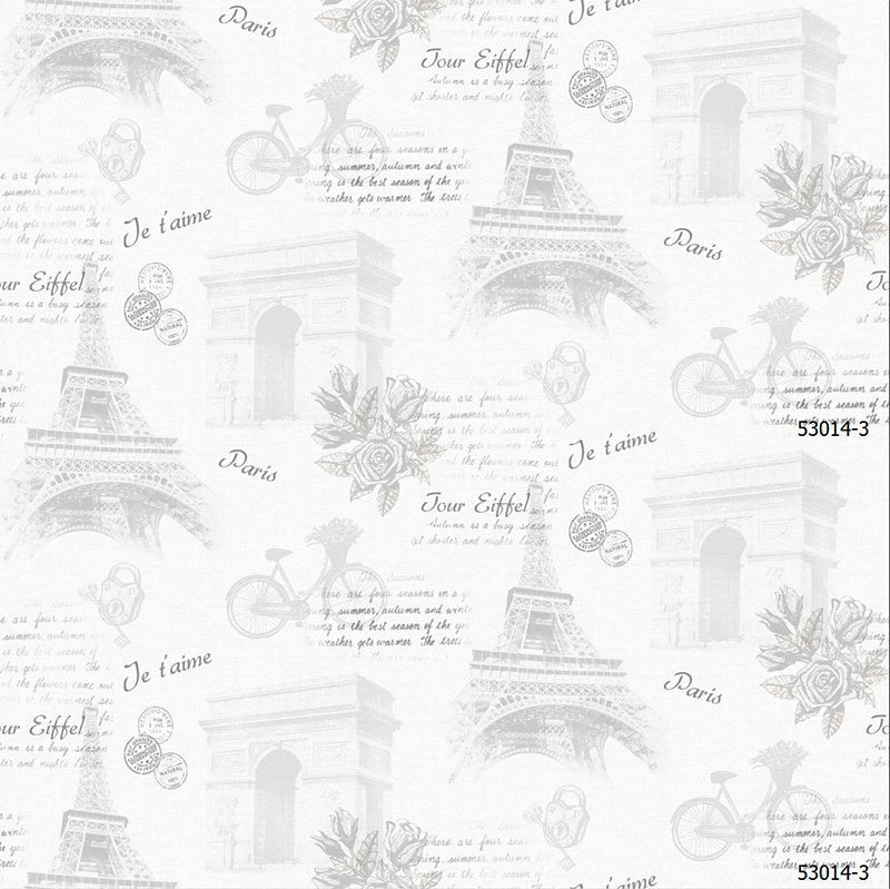 Điểm nhấn đặc biệt của mẫu giấy này nằm ở kiểu họa tiết mang đậm hơi thở của thủ đô Paris cổ kính và lãng mạn. Thay vì những hình ảnh sắc nét và hiện đại, Fairytale 53014-3 sử dụng các biểu tượng quen thuộc của Paris như tháp Eiffel kiêu hãnh, Khải Hoàn Môn uy nghi, hình ảnh xe đạp cổ thanh lịch, những đóa hồng mềm mại như vừa được hái, con tem thư hoài niệm và các dòng chữ viết tay tiếng Pháp đầy chất thơ như “Paris”, “Je t’aime” (Anh yêu em/Em yêu anh), “Jour Eiffel” (Ngày Eiffel). Các họa tiết này không đứng riêng lẻ mà được sắp xếp theo phong cách collage ngẫu hứng, gợi nhớ đến những trang nhật ký du lịch đầy kỷ niệm, những tấm bưu thiếp cũ kỹ hay một cuốn sổ lưu niệm chất chứa bao cảm xúc về một chuyến đi đáng nhớ.