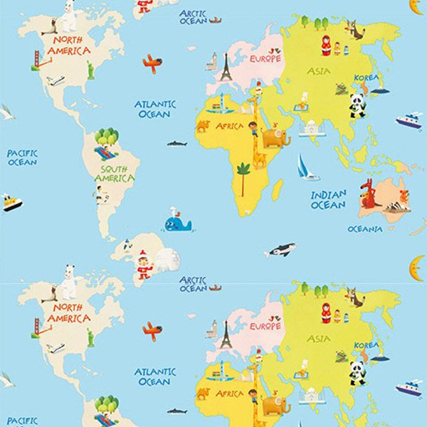 Điểm nhấn nổi bật nhất của Giấy Dán Tường Giá Rẻ Happy Story 2009-1B chính là họa tiết bản đồ thế giới được thể hiện theo phong cách hoạt hình đáng yêu và thân thiện với trẻ nhỏ. Tông màu chủ đạo là xanh dương nhạt (baby blue) của các đại dương bao la, tạo cảm giác tươi sáng, mát mẻ và mở rộng không gian. Màu xanh nhẹ nhàng này là phông nền lý tưởng cho các chi tiết minh họa đầy màu sắc, đặc biệt phù hợp với các căn phòng có diện tích khiêm tốn.