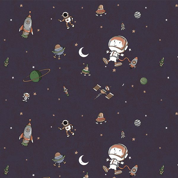 Kiểu họa tiết của sản phẩm là một bức tranh thu nhỏ về vũ trụ, được vẽ theo phong cách hoạt hình ngộ nghĩnh, đáng yêu và đầy màu sắc, rất phù hợp với trẻ em. Các hình ảnh như phi hành gia đang bay lơ lửng, tên lửa sẵn sàng cất cánh, những chiếc UFO bí ẩn, các hành tinh với vành đai đặc trưng và vô số vì sao lấp lánh được sắp xếp một cách ngẫu nhiên nhưng có chủ ý, tạo cảm giác chuyển động và một cuộc phiêu lưu không gian không ngừng. Đường nét của các họa tiết chủ yếu là mềm mại, tròn trịa, mang lại cảm giác thân thiện và an toàn, kích thích trí tưởng tượng phong phú của trẻ nhỏ.