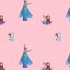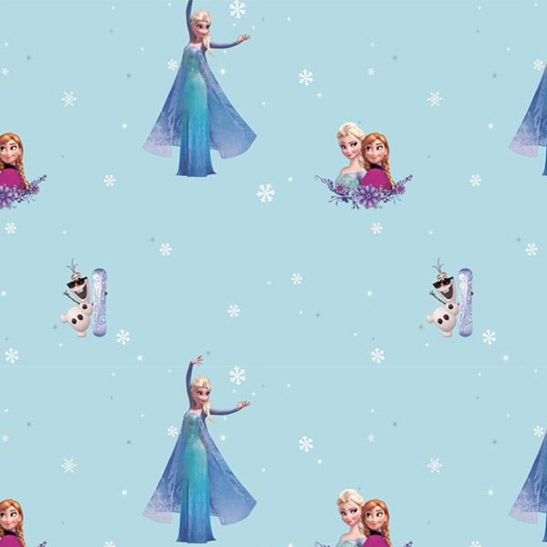 Điểm nhấn chính của mẫu Giấy Dán Tường này là họa tiết các nhân vật hoạt hình kinh điển từ bộ phim Frozen. Công chúa Elsa với chiếc váy xanh thẫm quyền lực, nàng Anna rạng rỡ trong trang phục nâu đỏ và hồng, cùng người tuyết Olaf đáng yêu với chiếc mũi cam đặc trưng, tất cả được tái hiện một cách sống động và rõ nét theo phong cách đồ họa 3D. Các nhân vật được sắp xếp xen kẽ một cách khéo léo, tạo thành một pattern lặp lại liên tục nhưng không gây cảm giác rối mắt. Họa tiết mang tính tạo hình, không phải vân tự nhiên, tập trung hoàn toàn vào việc kể câu chuyện cổ tích trên bức tường.