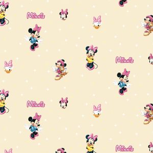 Ngay từ cái nhìn đầu tiên, Giấy Dán Tường Giá Rẻ Happy Story 6812-2B đã chinh phục trái tim mọi người bởi sự kết hợp màu sắc và họa tiết vô cùng đáng yêu. Tông màu nền chủ đạo là vàng kem hoặc be nhạt, một gam màu nhẹ nhàng, ấm áp, mang lại cảm giác dễ chịu và thân thiện. Màu nền này có tác dụng làm sáng không gian, tạo cảm giác căn phòng rộng rãi và thoáng đãng hơn. Trên nền màu thanh lịch đó, các nhân vật hoạt hình Disney quen thuộc như Chuột Minnie và Vịt Daisy hiện lên đầy sống động. Chuột Minnie được khắc họa với nhiều biểu cảm và tư thế khác nhau, nổi bật với chiếc nơ, váy và giày đặc trưng mang sắc hồng fuchsia/magenta đậm, đôi khi là váy xanh hoặc vàng, kết hợp cùng găng tay trắng và thân hình đen quen thuộc. Vịt Daisy duyên dáng xuất hiện với chiếc nơ hồng xinh xắn và mỏ vàng cam đáng yêu, thêm vào sự phong phú cho bức tranh tổng thể. Tên ‘Minnie’ cũng được cách điệu tinh tế bằng màu hồng đồng bộ, tạo điểm nhấn ngọt ngào. Đặc biệt, những ngôi sao nhỏ nhắn bốn cánh màu trắng và vàng nhạt được rải đều trên khắp bề mặt giấy, mang đến hiệu ứng lấp lánh như bầu trời đêm đầy sao, khơi gợi sự mơ mộng và khám phá cho trẻ. Sự hòa quyện giữa nền vàng kem dịu dàng và các chi tiết hồng, đen, trắng, vàng tươi tắn tạo nên một tổng thể hài hòa, ngọt ngào, tràn đầy năng lượng tích cực, hoàn toàn phù hợp với tâm lý và sở thích của trẻ nhỏ.