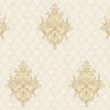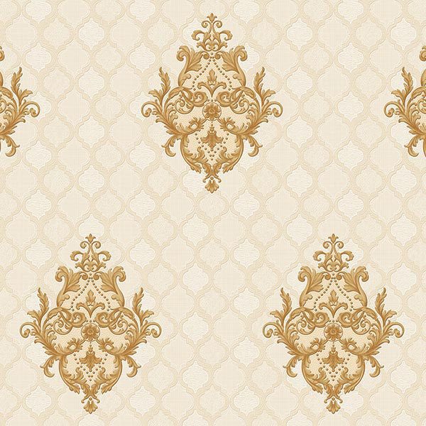 Khi chiêm ngưỡng mẫu giấy dán tường này, bạn sẽ cảm nhận ngay sự trang nhã toát ra từ tông màu chủ đạo là trắng ngà hoặc kem nhạt. Màu nền dịu dàng này tạo ra một bức tranh nền sáng sủa, thoáng đãng, là phông nền hoàn hảo để các họa tiết chính được tôn vinh. Nổi bật trên nền ấy là những đường nét họa tiết cổ điển màu vàng đồng ánh kim. Ánh vàng đồng có độ bóng nhẹ, bắt sáng tinh tế, mang đến cảm giác ấm áp, giàu có và xa hoa. Những họa tiết này không chỉ đơn thuần là hình in, mà còn được thể hiện một cách tinh xảo, với các đường cong uốn lượn mềm mại và chi tiết hoa lá cách điệu được sắp xếp đối xứng, lặp lại theo mô típ Damask truyền thống. Đây là một trong những mẫu hoa văn kinh điển, gợi nhớ về kiến trúc và nội thất châu Âu cổ kính. Bên cạnh họa tiết chính, bạn sẽ nhận thấy một lớp họa tiết nền chìm, có thể là hình học hoặc lưới mắt cáo (quatrefoil) cách điệu, với tông màu trắng ngà hoặc kem đậm hơn một chút so với màu nền chính. Lớp họa tiết chìm này thêm vào sự phong phú về thị giác, tạo chiều sâu và sự phức tạp đầy mê hoặc cho bề mặt tường. Bề mặt giấy có thể có cảm giác sần nhẹ hoặc hơi nhám khi chạm vào, một đặc điểm thường thấy ở giấy dán tường chất lượng, giúp tăng thêm tính chân thực và độ bền cho hoa văn.