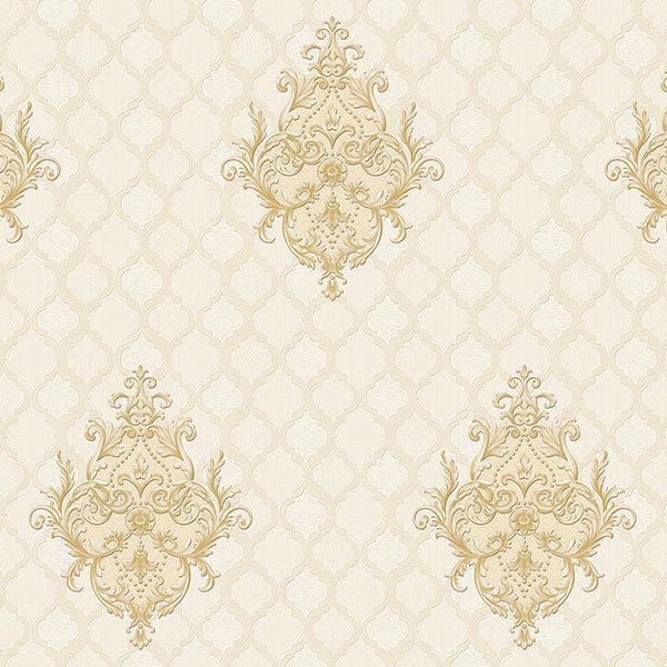 Cảm nhận về bề mặt sản phẩm, mặc dù thông tin chi tiết có thể khác nhau tùy nhà sản xuất, thường cho thấy sự thú vị trong kết cấu. Với tông màu trắng ngà, phần nền giấy có khả năng sở hữu bề mặt hơi sần nhẹ hoặc hiệu ứng giả vải (linen-like texture). Điều này không chỉ tăng tính chân thực, gần gũi mà còn giúp che đi một số khuyết điểm nhỏ trên tường. Phần họa tiết Damask màu vàng đồng có thể được xử lý để nổi nhẹ (embossed) hoặc có độ bóng khác biệt so với nền, giúp hoa văn trở nên sống động và bắt mắt hơn khi ánh sáng chiếu vào, tạo hiệu ứng thị giác ấn tượng.