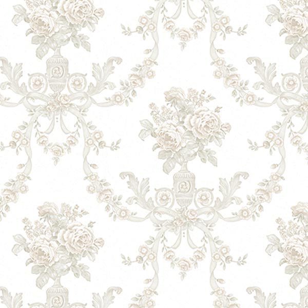Trên nền trắng ấy, những cụm hoa hồng xinh đẹp hiện lên một cách mềm mại và bay bổng. Sắc hồng phớt và kem nhạt của hoa gợi lên sự ngọt ngào, nữ tính và một chút hơi hướng hoài cổ, lãng mạn. Những bông hoa này được sắp xếp khéo léo trong các bình hoa kiểu cách, tạo nên bố cục cân đối, hài hòa. Xen kẽ với họa tiết hoa là các yếu tố trang trí mang đậm phong cách cổ điển và tân cổ điển, như dải ruy băng uốn lượn, lá cây acanthus cách điệu và các đường nét đối xứng tinh xảo. Các chi tiết này được thể hiện bằng màu xám nhạt hoặc beige thanh thoát, không gây cảm giác nặng nề mà ngược lại, tạo thêm chiều sâu và sự sang trọng cho tổng thể thiết kế.