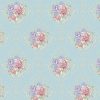 Bức tường được khoác lên mình một tông màu tổng thể dịu mát và trang nhã. Màu sắc chủ đạo là sự hòa quyện của các sắc độ xám nhạt và trắng ngà. Nền giấy được tạo bởi các sọc dọc đều đặn; trong đó, các sọc lớn hơn mang màu xám tro rất nhạt, gần như tiệp màu với trắng, tạo cảm giác nền nã, thoáng đãng. Xen kẽ là những sọc nhỏ hơn với tông xám nhạt hơn một chút, khéo léo phân chia và tạo chiều sâu cho cấu trúc sọc, giúp không gian như cao ráo hơn. Trên nền sọc xám nhạt ấy, những họa tiết hoa văn chìm kiểu damask hoặc brocade tinh xảo, màu trắng ngà hoặc kem nhạt, được in mờ đầy duyên dáng, thêm vào nét cổ điển và sang trọng một cách kín đáo. Điểm nhấn màu sắc tươi mới đến từ các cụm hoa hồng và hoa nhỏ được sắp đặt theo chiều dọc, nổi bật với màu xanh lam dịu mát, kết hợp hài hòa cùng sắc xanh lá ở phần lá và màu vàng kem, beige nhạt ở nhụy hoa, tạo nên bức tranh thiên nhiên mềm mại. Các đường nét uốn lượn nối kết các cụm hoa mang màu beige hoặc nâu đất nhạt, hoàn thiện tổng thể thiết kế.