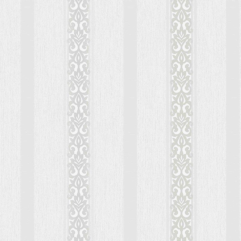 Họa tiết cổ điển được thiết kế đối xứng, lặp lại theo chiều dọc, với các đường nét uốn lượn, mềm mại, mang đậm dấu ấn quý phái của phong cách damask truyền thống. Những họa tiết này được in với màu xám nhạt, tạo sự nổi bật vừa phải trên nền trắng, không quá phô trương nhưng vẫn đủ để thu hút ánh nhìn. Tổng thể, kiểu vân này không chỉ mang lại cảm giác vừa cổ điển, vừa có nét thanh lịch hiện đại, mà còn giúp không gian trông cao hơn và có trật tự hơn nhờ hiệu ứng của các đường sọc dọc.