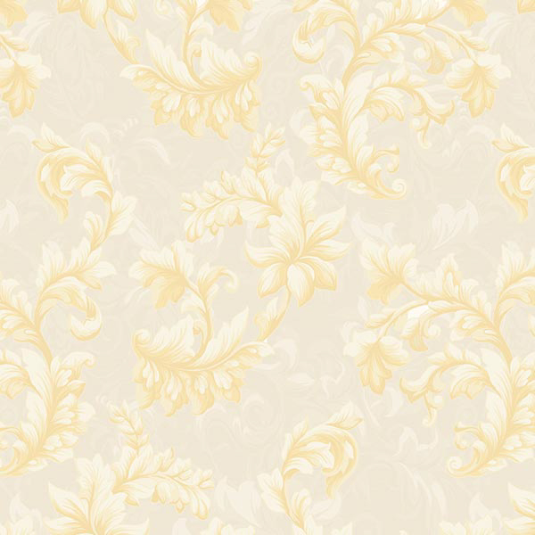 Ấn tượng đầu tiên mà mẫu giấy dán tường này mang lại chính là sự hài hòa và dịu mắt trong phối màu. Tông màu chủ đạo là trắng ngà hoặc kem sáng, tạo nên một lớp nền mềm mại, tràn ngập ánh sáng và có khả năng “ăn gian” diện tích, giúp căn phòng có cảm giác rộng rãi, thoáng đãng hơn. Trên nền màu trung tính đầy nhã nhặn ấy, các họa tiết hoa lá cổ điển hiện lên với sắc vàng nhạt, đôi khi phảng phất ánh vàng kem ấm áp hoặc chút vàng đồng vương giả. Sự kết hợp màu sắc này tạo nên một độ tương phản vừa phải, đủ để họa tiết nổi bật nhưng không hề gây cảm giác chói mắt hay nặng nề. Thay vào đó, nó toát lên vẻ đẹp trang nhã, tinh tế và một chút hoài niệm lãng mạn.