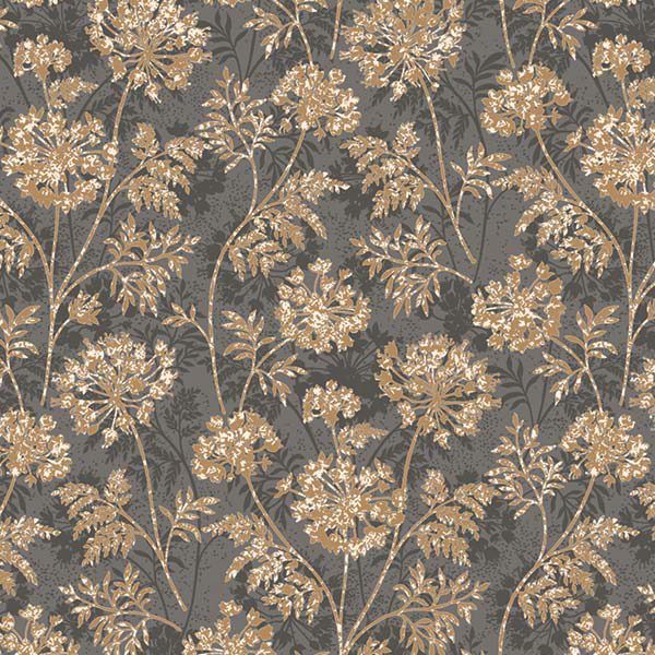 Điểm nhấn cốt lõi của Giấy Dán Tường Giá Rẻ The One 6826-3 nằm ở họa tiết hoa lá cách điệu. Những cụm hoa lớn, bung xòe tựa như những đóa Allium hay bồ công anh đang nở rộ, kết hợp cùng những cành lá mềm mại, uốn lượn một cách tự nhiên và đầy nghệ thuật. Họa tiết này được tạo hình không hoàn toàn tả thực mà mang tính trang trí cao, phù hợp với nhiều phong cách nội thất khác nhau. Sự lặp lại tuần hoàn của họa tiết tạo nên một dòng chảy liên tục trên bức tường, mang đến cảm giác hài hòa và nhịp điệu cho không gian. Bề mặt giấy có khả năng được xử lý mờ mịn (matte finish) ở phần nền xám, giúp hạn chế phản chiếu ánh sáng chói, tăng thêm vẻ sang trọng, hiện đại. Trong khi đó, phần họa tiết vàng đồng có thể được in nổi nhẹ hoặc có hiệu ứng ánh kim đặc trưng, tạo ra sự khác biệt về kết cấu khi chạm vào và làm cho họa tiết trở nên sống động hơn dưới các điều kiện ánh sáng khác nhau. Tổng thể, thiết kế này mang đến một vẻ đẹp vừa mạnh mẽ, cá tính với tông nền tối, vừa mềm mại, lộng lẫy với họa tiết hoa lá ánh kim.