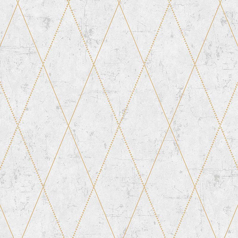 Ấn tượng đầu tiên mà Giấy Dán Tường Giá Rẻ The View TWall 9821-2 mang lại là sự kết hợp hài hòa giữa tông màu nhẹ nhàng và họa tiết hình học sang trọng. Sản phẩm sở hữu tông màu chủ đạo là xám trắng hoặc trắng ngà rất nhẹ nhàng, tạo cảm giác sáng sủa và thoáng đãng. Nền giấy này được xử lý đặc biệt, mang hiệu ứng giả bê tông mài hay vữa trát cũ, tạo nên chiều sâu và một chút hơi hướng thô mộc, tự nhiên. Trên nền độc đáo đó, các đường kẻ họa tiết hình thoi (diamond/argyle) màu vàng đồng (gold) nổi bật một cách tinh tế. Những đường kẻ này có thể là những chấm bi nhỏ li ti được sắp xếp liền mạch hoặc những đường kẻ mảnh, mang lại cảm giác thanh thoát, nhẹ nhàng. Sự tương phản giữa nét mộc mạc của nền giả bê tông và vẻ đẹp sang trọng của họa tiết vàng đồng tạo nên một tổng thể thu hút, không phô trương.