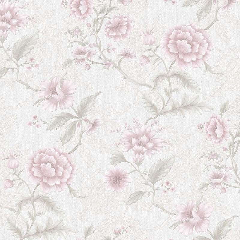 Điểm nhấn chính của mẫu giấy này là họa tiết hoa lá cổ điển được thể hiện bằng màu hồng phấn ngọt ngào. Những bông hoa, gợi nhớ đến vẻ đẹp đầy đặn của hoa mẫu đơn hay sự quyến rũ của hoa hồng cổ, được vẽ với nhiều lớp cánh mềm mại, bung nở một cách tự nhiên và đầy sức sống. Xen kẽ giữa những đóa hoa là những cành lá uốn lượn mềm mại, được thể hiện bằng màu xám xanh nhạt hoặc xanh lá cây phai. Sự kết hợp màu lá này mang đến một nét cân bằng tinh tế, tạo chiều sâu và điểm nhấn thị giác, tránh cảm giác đơn điệu.