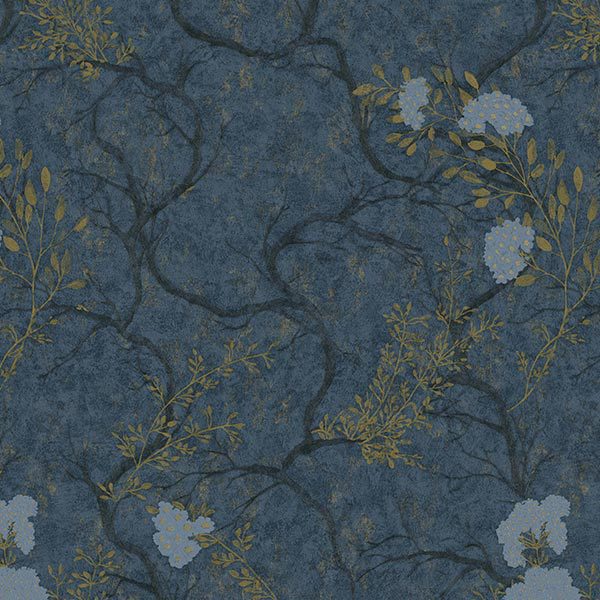 Điểm nhấn tinh tế và nghệ thuật của mẫu giấy này nằm ở họa tiết thiên nhiên được cách điệu. Những cành cây lớn uốn lượn mềm mại, mang sắc xám đen hoặc xanh đen sẫm, khéo léo hòa quyện vào nền, tạo nên một mạng lưới phức tạp nhưng không rối mắt, tăng thêm chiều sâu cho tổng thể. Từ những cành cây đó, các nhánh lá nhỏ nhắn vươn ra, khoác lên mình sắc vàng đồng cổ điển với ánh kim nhẹ. Sắc vàng này không hề chói gắt, mà lại trầm ấm, mang đến vẻ đẹp sang trọng, một chút hoài niệm và là điểm nhấn ấm áp trên nền xanh thẫm. Xen kẽ giữa tán lá là những cụm hoa nhỏ, như những đóa cẩm tú cầu, được thể hiện bằng màu xanh dương nhạt pha chút xám hoặc trắng ngà, tạo nên sự tương phản nhẹ nhàng, hài hòa với cả màu nền và sắc vàng của lá. Tổng thể họa tiết Giấy Dán Tường Hoa Lá này được bố trí lặp lại một cách duyên dáng, cân đối, tạo nên một bức tranh thiên nhiên đầy tính nghệ thuật, gợi liên tưởng đến khu rừng đêm tĩnh lặng hay những bức tranh lụa cổ xưa.