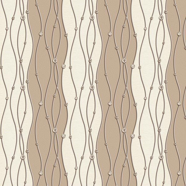 Không dừng lại ở đó, sản phẩm còn được điểm xuyết một cách tinh tế bằng các chi tiết nhỏ lấp lánh. Đây có thể là những hạt kim tuyến mịn hoặc giả đá nhỏ, được bố trí khéo léo dọc theo các đường chỉ họa tiết. Những chi tiết này không quá phô trương nhưng đủ để bắt sáng nhẹ nhàng dưới ánh đèn, mang lại hiệu ứng lung linh, huyền ảo và tăng thêm vẻ sang trọng, quyến rũ cho bức tường. Sự kết hợp giữa màu sắc nền nã, họa tiết lượn sóng mềm mại và chi tiết lấp lánh tạo nên một tổng thể hài hòa, vừa cổ điển vừa hiện đại, phù hợp với nhiều phong cách thiết kế.