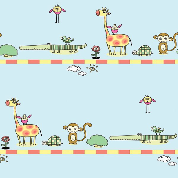 Ngay từ cái nhìn đầu tiên, Giấy Dán Tường Hàn Quốc Galaxy 7829-1 đã thu hút bởi bảng màu tươi sáng và những họa tiết hoạt hình ngộ nghĩnh. Tông màu nền chủ đạo là xanh da trời nhạt, dịu mát và thoáng đãng, như bầu trời trong xanh vào một ngày nắng đẹp. Trên nền trời ấy, một đoàn tàu chở đầy những người bạn động vật đáng yêu đang băng qua khung cảnh rực rỡ. Hươu cao cổ cổ dài vươn tới những đám mây, chú khỉ tinh nghịch đu trên cành cây, rùa chậm rãi bò, cá sấu mỉm cười thân thiện, và những chú chim nhỏ hót líu lo trên những đóa hoa đủ sắc. Mỗi nhân vật được cách điệu theo phong cách vẽ tay hồn nhiên, với đường nét mềm mại và biểu cảm vui tươi, gần gũi với thế giới của trẻ thơ.