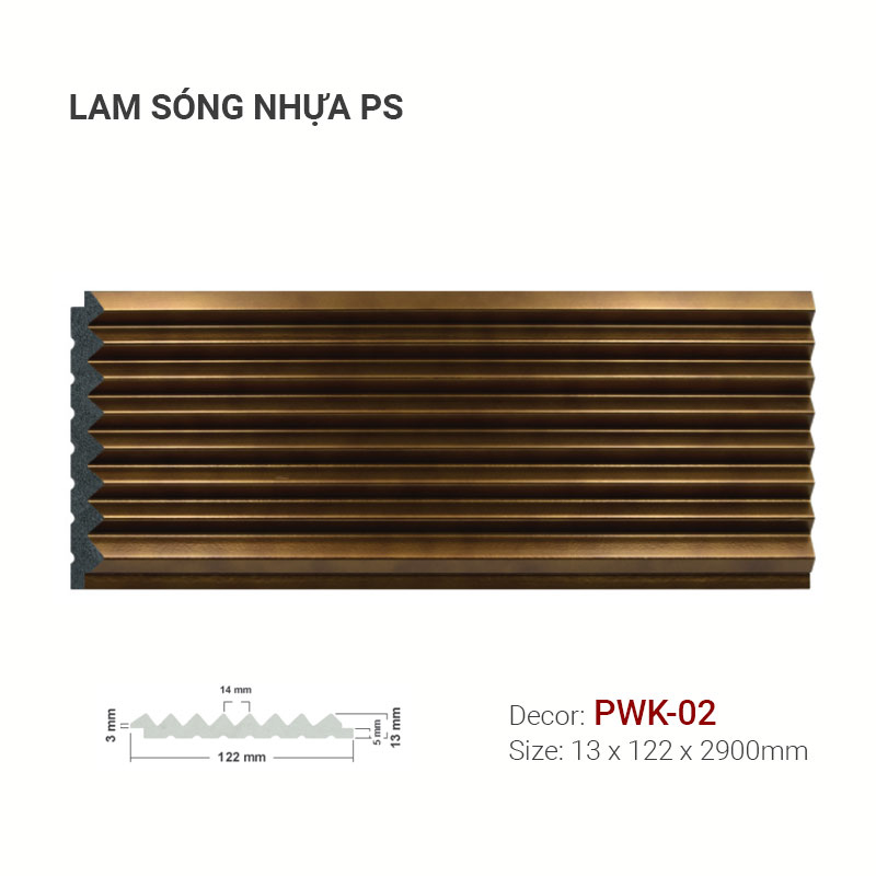 Nếu bạn đang tìm kiếm một giải pháp Ốp Trần-Ốp Tường Trong Nhà vừa đẹp, bền, dễ bảo trì lại mang đậm dấu ấn hiện đại và sang trọng, thì Lam Nhựa PS PWK-02 chắc chắn là một sự lựa chọn không thể bỏ qua. Với màu nâu ấm áp, hiệu ứng ánh kim tinh tế và cấu trúc lam sóng 3D độc đáo, sản phẩm này sẽ biến không gian của bạn trở nên ấn tượng và đẳng cấp hơn.