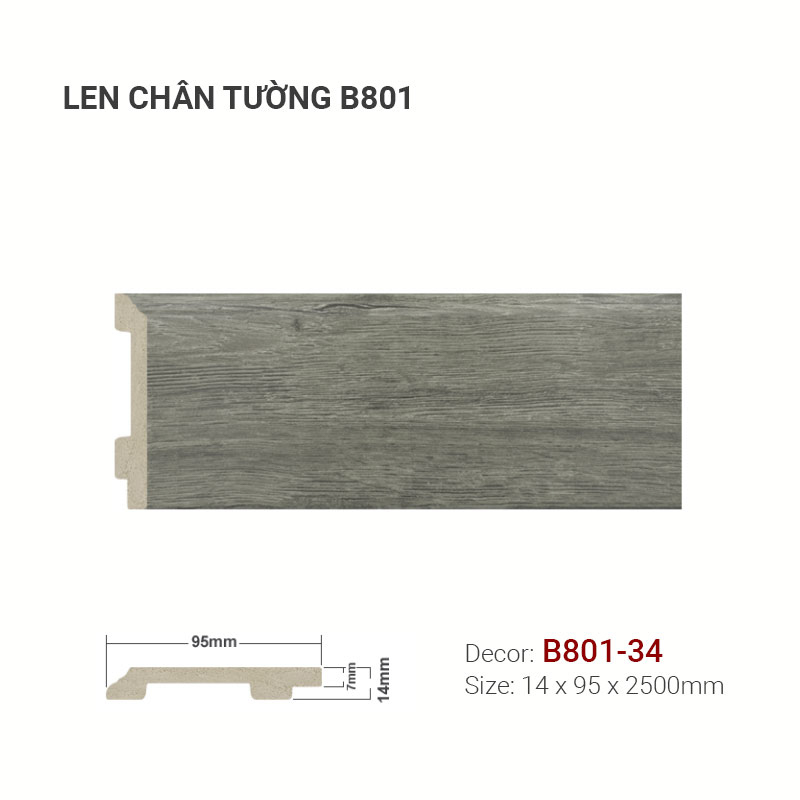 Len Tường B801-34 là sự lựa chọn tuyệt vời để hoàn thiện không gian nội thất hiện đại, mang đến vẻ đẹp tinh tế, sạch sẽ và chỉn chu. Với màu xám trung tính linh hoạt, vân gỗ tự nhiên mềm mại và bề mặt mờ mịn dễ vệ sinh, sản phẩm này không chỉ đáp ứng yêu cầu thẩm mỹ mà còn đảm bảo tính năng bảo vệ chân tường hiệu quả. Lắp đặt Len Tường B801-34 là cách đơn giản nhưng hiệu quả để nâng tầm không gian sống, thể hiện gu thẩm mỹ hiện đại và sự đầu tư vào từng chi tiết nhỏ.
