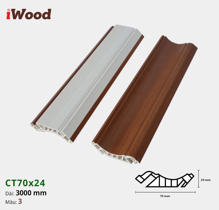 Để giúp quý khách hàng dễ dàng hình dung và tính toán vật tư, chúng tôi cung cấp thông số kỹ thuật chi tiết của sản phẩm Nẹp Nhựa Cổ Trần Iwood CT70x24-3: