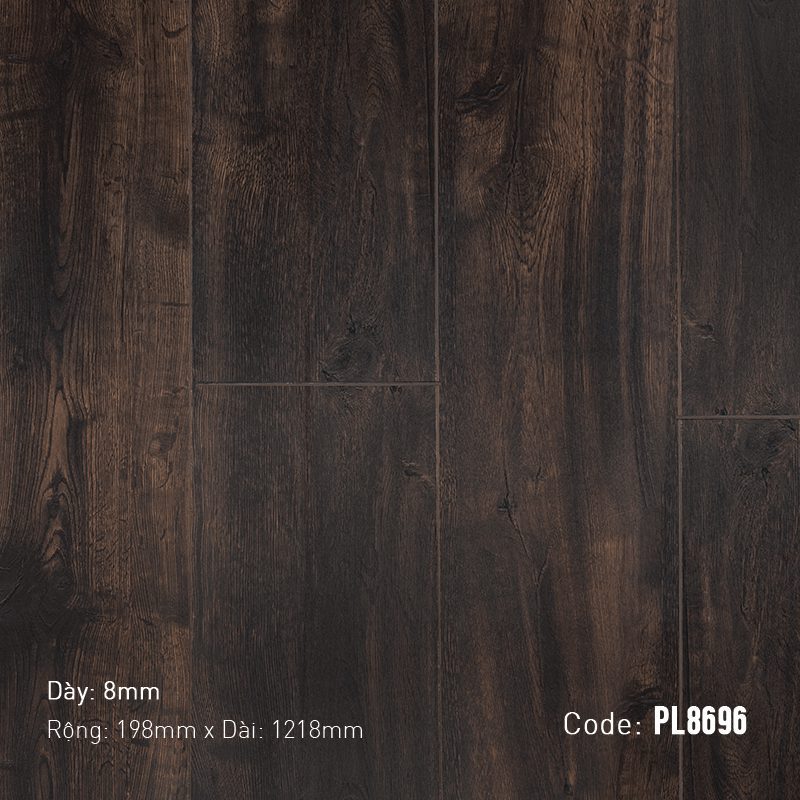 Kiểu vân gỗ trên sản phẩm PL8696 được tái hiện một cách chân thực, mô phỏng vẻ đẹp của các loại gỗ tự nhiên quý như gỗ Sồi sẫm màu hoặc Sàn Gỗ Óc Chó Walnut với những đường vân mạnh mẽ đặc trưng. Các đường vân thẳng, vân núi (crown cut) và mắt gỗ (knots) được phân bổ ngẫu nhiên trên từng tấm ván, đảm bảo mỗi mét vuông sàn đều là độc nhất vô nhị, mang đậm dấu ấn tự nhiên. Thớ gỗ rõ ràng, có độ tương phản vừa phải giữa các vùng màu sáng tối, mang lại cảm giác cứng cáp và bền bỉ. Bề mặt sàn được xử lý với hiệu ứng sần nhẹ, không bóng loáng, giúp tăng cường tính thẩm mỹ mộc mạc và đồng thời cải thiện đáng kể khả năng chống trơn trượt, tạo sự an toàn khi di chuyển, ngay cả khi đi chân trần. Công nghệ vân nổi theo thớ gỗ (Embossed In Register – EIR) mang đến trải nghiệm xúc giác chân thực, khiến bạn có cảm giác như đang bước trên sàn gỗ tự nhiên cao cấp.