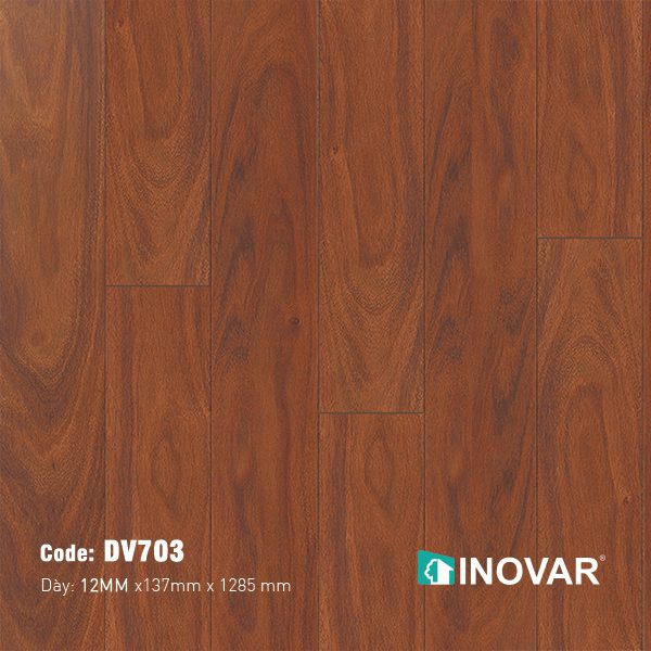 Sàn Gỗ Inovar 12mm Durashine DV703 nổi bật với tông màu nâu đỏ chủ đạo, mang sắc thái ấm áp, cổ điển và sang trọng, gợi nhớ đến màu gỗ cánh gián hoặc gỗ gụ tự nhiên. Trong đó, sắc nâu trầm chiếm ưu thế, được điểm xuyết bởi những ánh đỏ tinh tế, tạo nên một tổng thể màu sắc đậm đà và có chiều sâu. Các đường vân gỗ có tông màu nâu sẫm hơn, chạy dọc theo thớ, làm nổi bật vẻ đẹp tự nhiên và tăng tính chân thực cho sản phẩm. Tông màu này đặc biệt phù hợp với những không gian cần tạo cảm giác ấm cúng, gần gũi, hoặc những không gian có diện tích vừa và lớn, đủ ánh sáng tự nhiên để tôn lên vẻ đẹp của màu gỗ mà không gây cảm giác nặng nề. Trong không gian thiếu sáng, màu gỗ này có thể làm không gian trở nên tối hơn, do đó cần kết hợp với tường và nội thất sáng màu để cân bằng.