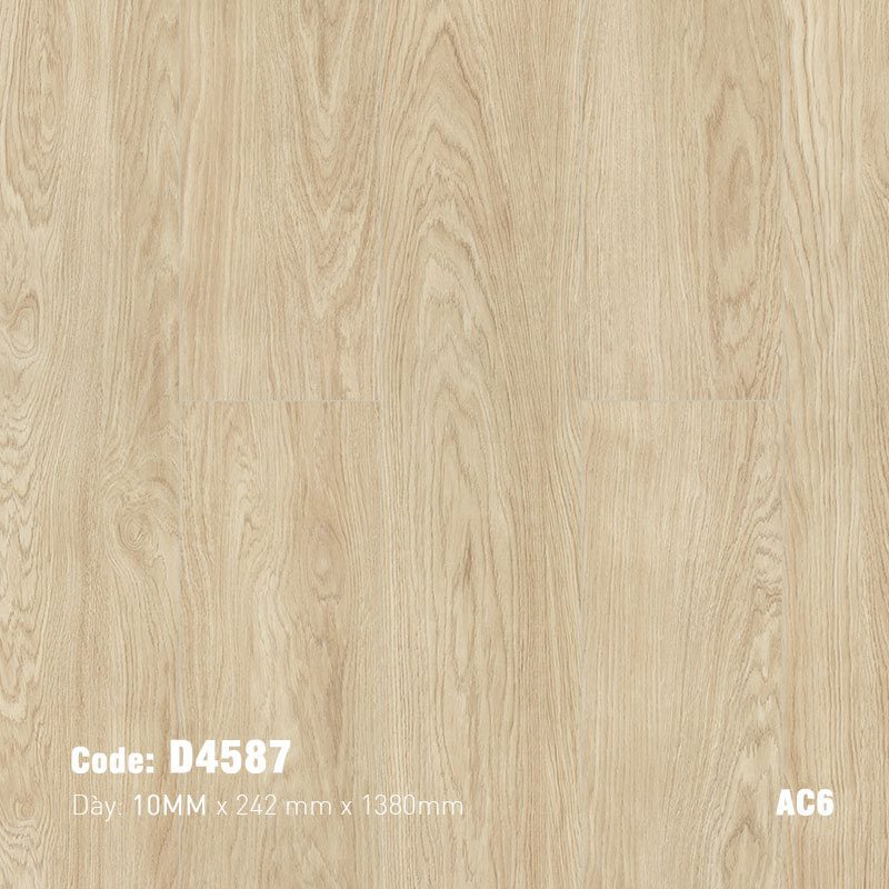 Kiểu vân gỗ của D4587 được lấy cảm hứng từ những phiến gỗ sồi Châu Âu kinh điển. Thay vì những đường vân rối rắm, sản phẩm tập trung vào những đường vân thẳng chạy dọc theo chiều dài tấm ván, tạo cảm giác liền mạch và thanh thoát. Xen kẽ đó là các họa tiết vân núi (crown-cut) mềm mại, uyển chuyển, phá vỡ sự đơn điệu và làm tăng thêm tính thẩm mỹ. Các mắt gỗ nhỏ được tái hiện một cách chọn lọc và tinh tế, cùng với những biến thể màu sắc nhẹ nhàng, góp phần tạo nên cảm giác đây là một mặt sàn được làm từ gỗ tự nhiên đích thực, không hề giả tạo hay thô cứng. Vân gỗ được tiết chế ở mức độ vừa phải, không quá dày đặc, đảm bảo sự cân bằng và hài hòa cho tổng thể không gian khi lắp đặt.