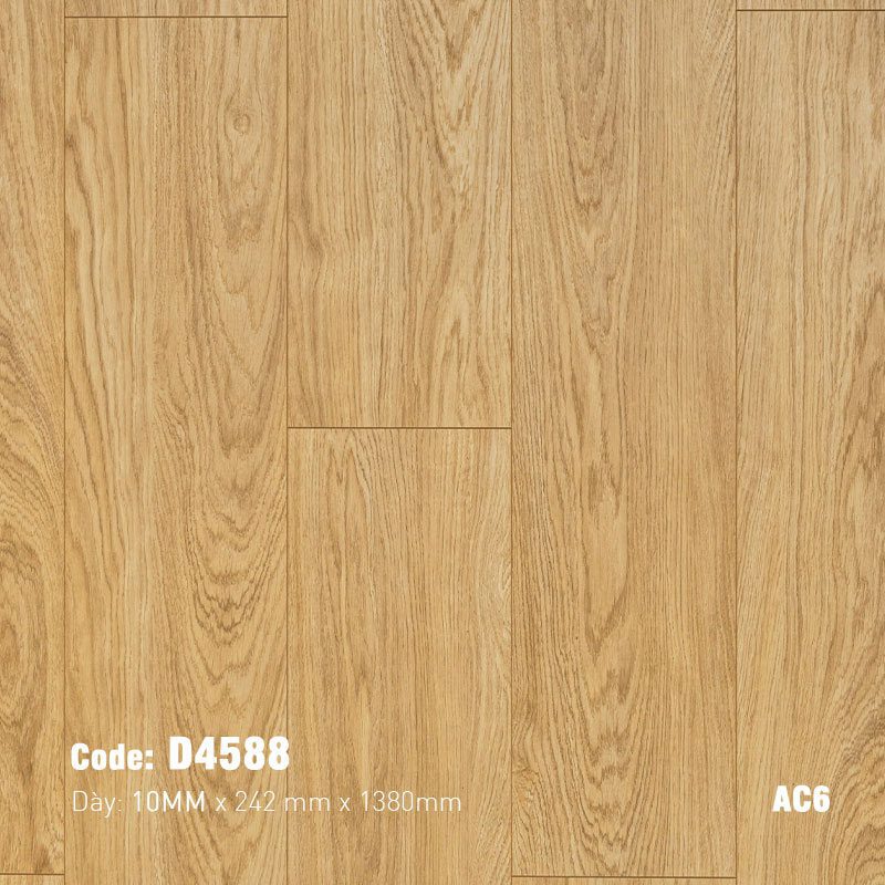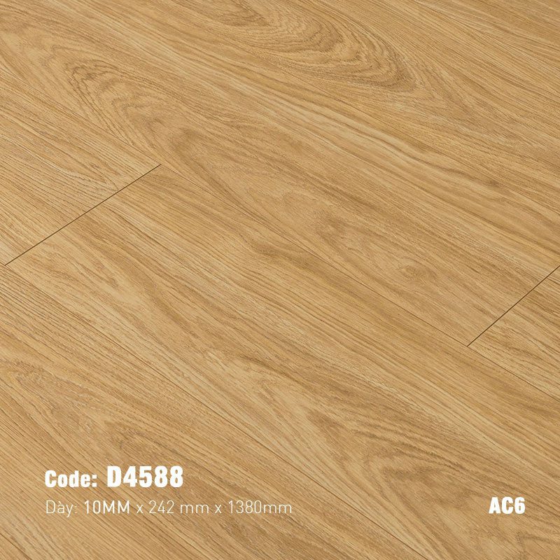 - Tiêu Chuẩn Chống Mài Mòn AC6: Đây là chỉ số chống mài mòn cao nhất hiện nay đối với sàn gỗ công nghiệp. AC6 cho thấy sàn có khả năng chịu đựng cực tốt các tác động từ việc đi lại cường độ cao, ma sát, trầy xước do đồ vật, bánh xe ghế, hoặc vật nuôi. Điều này làm cho D4588 trở thành lựa chọn lý tưởng cho cả không gian dân dụng và thương mại có lưu lượng người qua lại lớn.