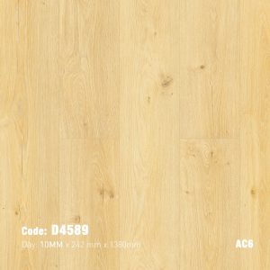 • Công nghệ Aqua: Yếu tố “Aqua” trong tên sản phẩm nhấn mạnh khả năng kháng ẩm được tăng cường. Mặc dù không phải là Sàn Gỗ Chống Nước hoàn toàn như sàn nhựa, nhưng với công nghệ này, sàn D4589 có khả năng chịu ẩm tốt hơn đáng kể so với sàn gỗ công nghiệp thông thường, cho phép ứng dụng ở các khu vực có độ ẩm cao hơn như sảnh ra vào, khu vực bếp (với điều kiện không bị ngập nước và tuân thủ quy trình lắp đặt).