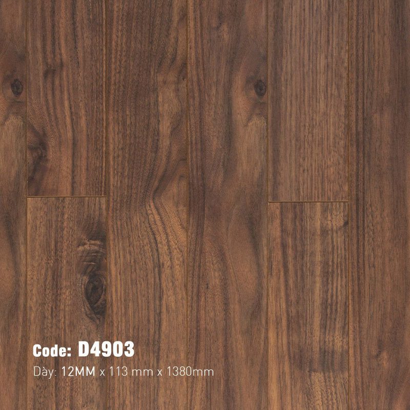 Kiểu vân gỗ trên tấm ván D4903 được thiết kế để tái hiện chân thực nhất vẻ đẹp ngẫu nhiên và độc đáo của gỗ thật. Bạn sẽ tìm thấy sự kết hợp hài hòa giữa những đường vân thẳng, sắc nét chạy dọc theo chiều dài tấm ván và những đường vân núi, vân xoáy mềm mại, uốn lượn đặc trưng xung quanh các mắt gỗ. Những chi tiết này được in ấn và dập nổi một cách tỉ mỉ (có thể sử dụng công nghệ EIR – Embossed In Register), tạo cảm giác như đang chạm vào bề mặt gỗ tự nhiên. Vân gỗ không quá dày đặc, tạo cảm giác thoáng đãng nhưng vẫn đủ chi tiết để thu hút ánh nhìn. Sự liên tục của vân trên từng tấm ván và khi ghép các ván lại với nhau giúp tạo nên một mặt sàn liền mạch, tự nhiên, khó phân biệt với Sàn Gỗ Tự Nhiên nếu chỉ nhìn lướt qua.