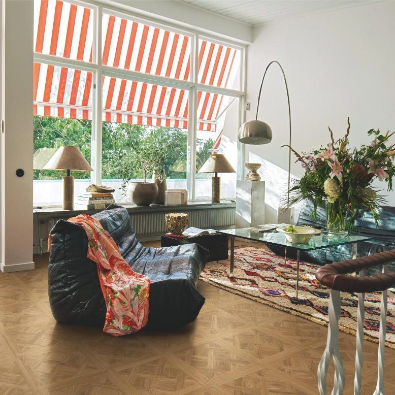 Điểm nhấn làm nên giá trị đặc biệt của Sàn Gỗ Pergo Pattern 04151 chính là họa tiết lát sàn Versailles. Đây là một trong những kiểu lát sàn gỗ nghệ thuật và phức tạp nhất, có nguồn gốc từ Cung điện Versailles của Pháp, biểu tượng của sự xa hoa và quyền quý. Họa tiết này được tái hiện một cách tỉ mỉ trên từng tấm ván, tạo thành những ô vuông lớn. Bên trong mỗi ô vuông là sự sắp đặt đầy tính toán của các thanh gỗ nhỏ hơn, được ghép lại theo các đường chéo và song song, tạo nên một mô hình đối xứng, đan xen đầy ấn tượng. Sự phức tạp và tinh xảo của họa tiết Versailles biến sàn nhà thành một bức tranh nghệ thuật, một điểm nhấn trung tâm thu hút mọi ánh nhìn.
