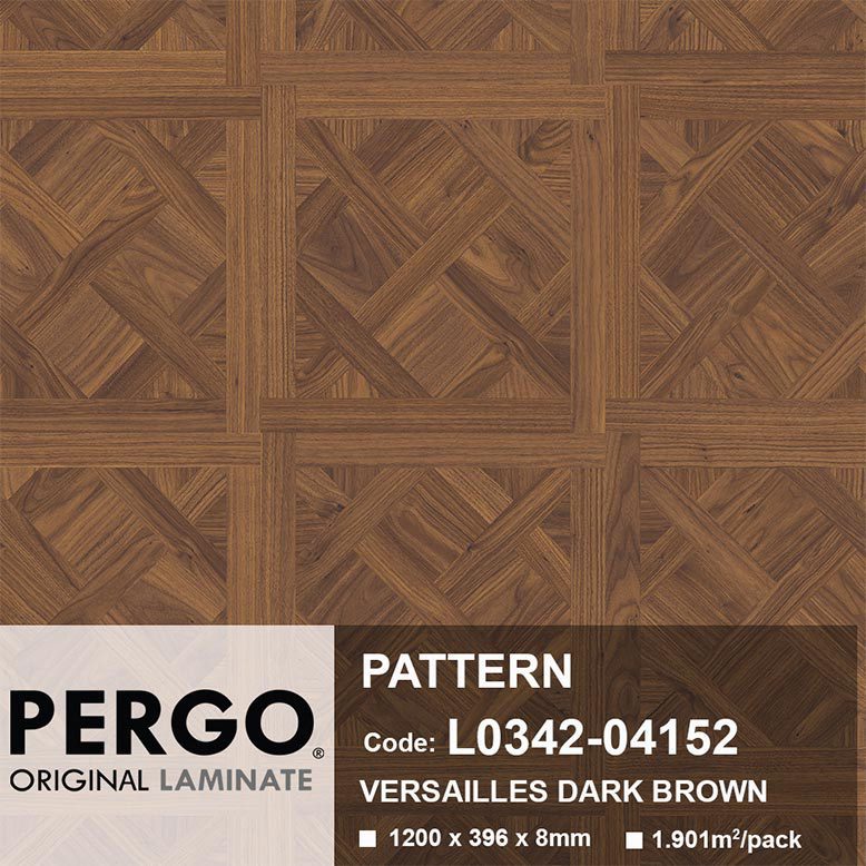 Điểm nhấn đặc biệt và làm nên giá trị nghệ thuật của Sàn Gỗ Pergo Pattern 04152 chính là họa tiết Versailles kinh điển. Đây là một kiểu lát sàn nghệ thuật vô cùng tinh xảo, có nguồn gốc từ các cung điện và lâu đài tráng lệ của Pháp. Họa tiết này được hình thành từ việc ghép nối các thanh gỗ nhỏ lại với nhau để tạo thành những ô vuông lớn. Bên trong mỗi ô vuông là các chi tiết đan chéo phức tạp và được bao bọc bởi một đường viền rõ ràng, tạo nên một tổng thể đối xứng, hài hòa và đầy tính biểu tượng. Vân gỗ được mô phỏng trên từng tấm laminate của Sàn Gỗ Pergo Pattern 04152 có thể là vân gỗ Óc Chó (Walnut) hoặc một loại gỗ quý tương tự, với các đường vân thẳng xen kẽ những đường lượn sóng mềm mại, uyển chuyển, tái hiện chân thực vẻ đẹp tự nhiên của gỗ thật. Công nghệ in tiên tiến của Pergo đảm bảo các chi tiết nhỏ nhất như mắt gỗ, thớ gỗ được tái hiện một cách tự nhiên và sắc nét đến kinh ngạc, mang lại cảm giác như đang chiêm ngưỡng sàn gỗ tự nhiên thực thụ, dù đây là sàn gỗ công nghiệp.