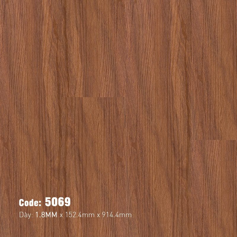 Thiết kế vân gỗ của mã K-5069 được chăm chút tỉ mỉ, tái hiện chân thực từng đường nét của thớ gỗ tự nhiên. Những đường sọc thẳng, mảnh chạy dọc theo chiều dài tấm ván tạo cảm giác không gian được mở rộng. Mật độ vân gỗ vừa phải, không quá dày đặc gây rối mắt, cũng không quá thưa thớt làm mất đi vẻ tự nhiên. Xen kẽ là những gợn sóng nhẹ nhàng, phá vỡ sự lặp lại đơn điệu, tăng thêm tính sống động cho bề mặt sàn. Các mắt gỗ được tiết chế một cách tinh tế, chỉ xuất hiện ở mức độ vừa phải, không quá phô trương, phù hợp với những không gian cần sự thanh lịch, nhẹ nhàng. Sự chuyển tiếp màu sắc uyển chuyển từ nâu nhạt sang nâu đậm hơn giữa các thớ gỗ mang lại chiều sâu và độ chân thực, khó phân biệt với sàn gỗ thật.
