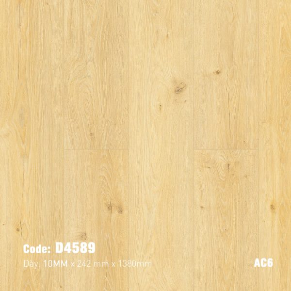 - Công nghệ Aqua: Yếu tố “Aqua” trong tên sản phẩm nhấn mạnh khả năng kháng ẩm được tăng cường. Mặc dù không phải là Sàn Gỗ Chống Nước hoàn toàn như sàn nhựa, nhưng với công nghệ này, sàn D4589 có khả năng chịu ẩm tốt hơn đáng kể so với sàn gỗ công nghiệp thông thường, cho phép ứng dụng ở các khu vực có độ ẩm cao hơn như sảnh ra vào, khu vực bếp (với điều kiện không bị ngập nước và tuân thủ quy trình lắp đặt).
