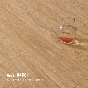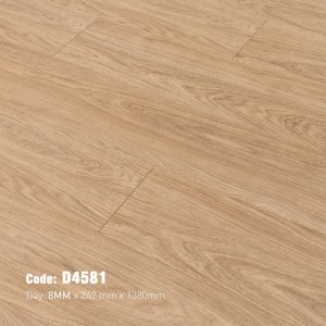 Vân gỗ sồi trên bề mặt D4581 được mô phỏng một cách sống động và chân thực. Bạn có thể thấy rõ những đường vân thẳng đặc trưng xen kẽ với các cụm vân núi (cathedral grain) mềm mại, tạo nên sự đa dạng và chiều sâu cho tấm ván. Các chi tiết nhỏ như mắt gỗ tinh tế hay những đường nứt giả được sắp đặt ngẫu nhiên, không theo một quy luật máy móc nào, càng làm tăng thêm cảm giác như đang chiêm ngưỡng sàn gỗ tự nhiên thật. Bề mặt vân gỗ có độ sần nhẹ và mờ mịn (matt hoặc satin finish), không quá thô ráp gây khó chịu nhưng cũng không quá trơn trượt. Đặc biệt, công nghệ dập nổi đồng bộ (EIR – Embossed In Register) có thể được áp dụng, giúp các đường vân nổi lên trùng khớp hoàn hảo với họa tiết in, mang đến cảm giác chân thật đến từng giác quan khi chạm vào. Điều này không chỉ nâng cao tính thẩm mỹ mà còn tăng cường khả năng chống trơn trượt, mang lại sự an toàn cho mọi thành viên trong gia đình, kể cả trẻ nhỏ và người lớn tuổi.