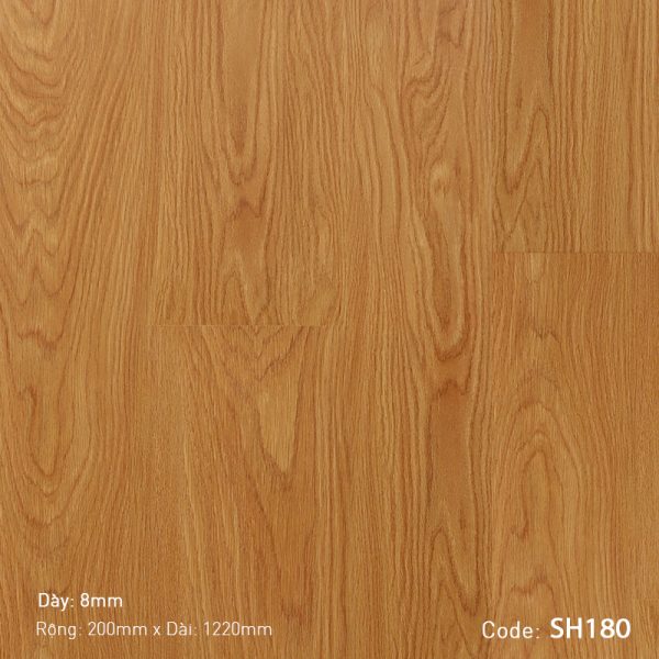 - Độ bền của sàn SH180 như thế nào? Với độ dày 8mm, sản phẩm có độ bền phù hợp cho sử dụng dân dụng và khu vực thương mại có mật độ đi lại trung bình. Bề mặt có lớp phủ chống trầy xước ở mức khá, giúp sàn giữ được vẻ đẹp theo thời gian nếu được sử dụng và bảo quản đúng cách.