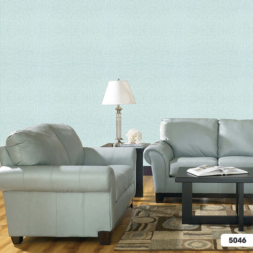 Ngay từ cái nhìn đầu tiên, Vải Dán Tường Harmony 4 Season 5046 đã chinh phục người xem bởi tông màu chủ đạo là xanh dương nhạt, gợi nhớ đến bầu trời trong veo hay mặt biển lặng sóng vào buổi sớm mai. Sắc xanh “baby blue” hoặc “light sky blue” này không chỉ tươi mát mà còn mang đến cảm giác thanh bình, vô cùng dễ chịu cho thị giác. Điểm đặc biệt nằm ở sự pha trộn tinh tế: xen kẽ giữa các sợi dệt màu xanh là những sợi có sắc độ trắng kem hoặc trắng ngà. Sự kết hợp này tạo nên một hiệu ứng chuyển màu nhẹ nhàng, không quá rõ rệt nhưng đủ để tăng chiều sâu và sự sống động cho bề mặt tường. Tổng thể màu sắc rất sáng, là giải pháp lý tưởng để “ăn gian” diện tích, làm cho không gian trở nên rộng rãi và tận dụng tối đa nguồn ánh sáng tự nhiên.