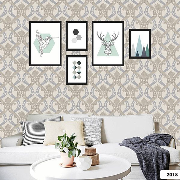 Ngay từ cái nhìn đầu tiên, Vải Dán Tường Harmony Classic 2018 đã chinh phục người xem bởi bảng màu trang nhã và tinh tế. Tông màu nền chủ đạo là trắng ngà hoặc kem rất nhạt, tạo cảm giác không gian sáng sủa, thoáng đãng và thanh lịch. Trên nền sáng này, các họa tiết cổ điển dạng damask được thể hiện với sự phối hợp hài hòa của hai gam màu phụ. Lớp họa tiết chính, nổi bật hơn, mang sắc xám tro nhạt pha chút ánh be ấm áp (greige), tạo nên sự mềm mại và sang trọng. Lớp họa tiết thứ hai, nằm chìm hơn và xen kẽ, có màu xám xanh nhạt (dusty blue-grey), mang đến một chút điểm xuyết mát mẻ và chiều sâu tinh tế cho tổng thể thiết kế. Sự kết hợp màu sắc này thuộc nhóm màu Trắng, Xám, Xanh với độ sáng Light, phù hợp với những không gian cần sự nhẹ nhàng, có thể ứng dụng tốt trong cả những căn phòng nhiều ánh sáng tự nhiên lẫn những khu vực cần tăng cường độ sáng.