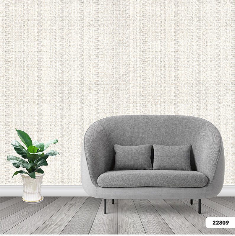 Điểm đặc biệt và tạo nên sự khác biệt của mã 22809 nằm ở kiểu vân dệt sọc dọc mảnh mai. Khác với những đường kẻ sọc truyền thống, vân sọc trên sản phẩm này được tạo nên từ các cụm sợi nhỏ hoặc các điểm ảnh li ti, gợi nhớ đến bề mặt của các loại vải tự nhiên cao cấp như linen hay lụa thô. Các đường sọc này có ánh sắc xám rất nhạt hoặc một tông beige cực kỳ nhẹ nhàng, gần như hòa quyện vào nền chính. Sự phối hợp màu sắc và vân dệt này tạo nên một hiệu ứng thị giác đa chiều tinh tế, không gây cảm giác đơn điệu mà vẫn giữ được sự hài hòa và chiều sâu cho bức tường.