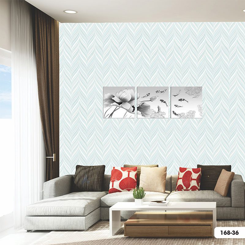 Họa tiết trên Vải Dán Tường Harmony Vision 168-36 là một thiết kế trừu tượng đầy tính nghệ thuật. Lấy cảm hứng từ hình ảnh những chiếc lá hoặc lông vũ, các đường nét được cách điệu một cách mềm mại, xếp lớp theo chiều dọc tạo thành một dạng vân gợn sóng hoặc ziczac (chevron) uyển chuyển. Đây không phải là những đường vân cứng nhắc hay lặp lại đơn điệu, mà là sự nối tiếp của những đường cong thanh thoát, liên tục và nhịp nhàng. Sự lặp lại có chủ đích của họa tiết tạo ra một hiệu ứng thị giác thu hút, mang tính trang trí cao mà không hề gây cảm giác rối mắt hay nặng nề. Các đường nét mảnh mai, uyển chuyển gợi cảm giác mềm mại, nhẹ nhàng, tựa như những gợn sóng lăn tăn trên mặt nước hay những tán lá đung đưa trong gió. Có thể có những điểm nhấn tinh tế của một sắc xám rất nhạt hoặc một tông xanh đậm hơn một chút trong các đường nét để tạo chiều sâu, nhưng chúng hoàn toàn không lấn át hai màu chính, giữ cho tổng thể luôn dịu mắt và hài hòa.