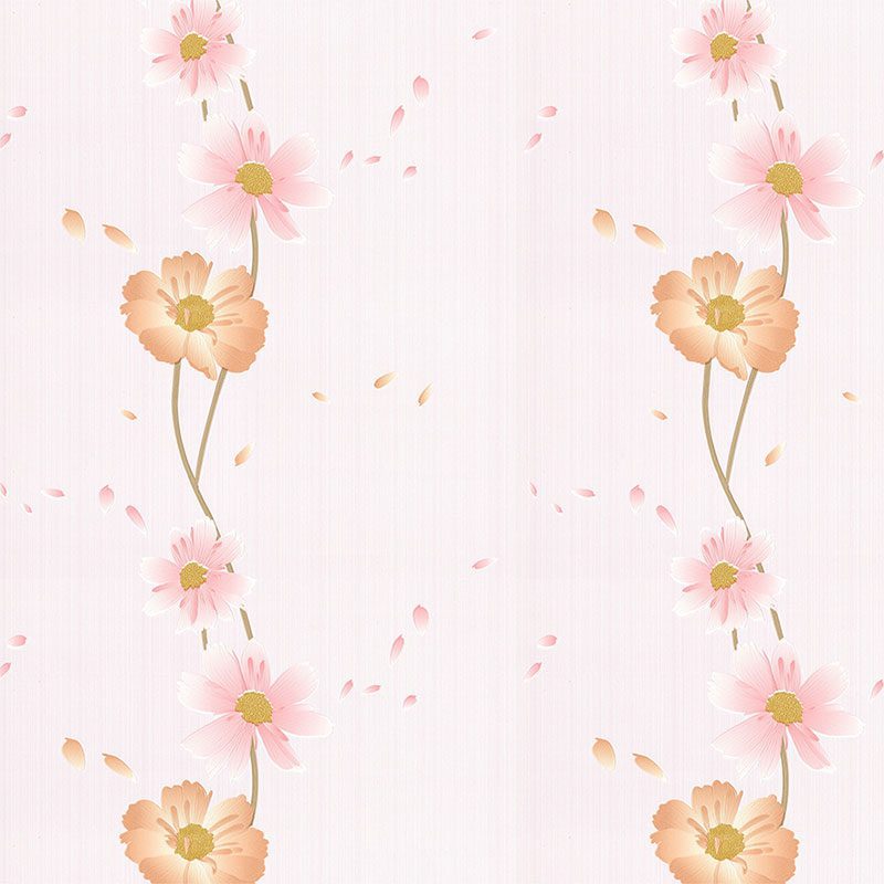 Trên nền trắng ngà trang nhã ấy, họa tiết hoa cách điệu nổi bật lên đầy duyên dáng. Những bông hoa, gợi nhớ đến vẻ đẹp mong manh của hoa cúc hoặc hoa cosmos, được thể hiện qua hai gam màu chính: hồng phấn ngọt ngào và cam đào ấm áp. Sự tinh tế nằm ở cách các gam màu này chuyển sắc nhẹ nhàng, tạo độ sâu và vẻ tự nhiên như những cánh hoa thật đang rung rinh trong gió. Xen kẽ là những cánh hoa rơi nhẹ nhàng, tạo nên một bức tranh tường sống động và thơ mộng.