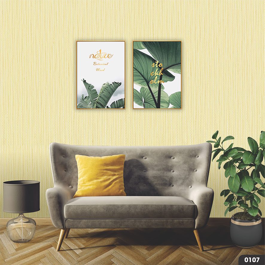 Điểm nhấn nổi bật nhất của Vải Không Dệt Dán Tường Tango 0107 chính là tông màu chủ đạo vàng kem (creamy yellow) hoặc vàng pastel rất nhẹ nhàng. Màu sắc này không rực rỡ hay chói gắt, mà thay vào đó là sự dịu dàng, ấm áp. Pha lẫn trong đó là chút ánh sắc trắng ngà, tạo nên một gam màu tổng thể tươi sáng nhưng vẫn giữ được nét thanh thoát, sang trọng. Tông màu vàng nhẹ này có khả năng phản xạ ánh sáng tốt, giúp không gian trở nên bừng sáng, có cảm giác rộng rãi và thoáng đãng hơn đáng kể. Đây là lựa chọn lý tưởng cho những căn phòng có diện tích khiêm tốn hoặc khu vực thiếu ánh sáng tự nhiên, giúp khắc phục nhược điểm và tạo hiệu ứng thị giác tích cực.